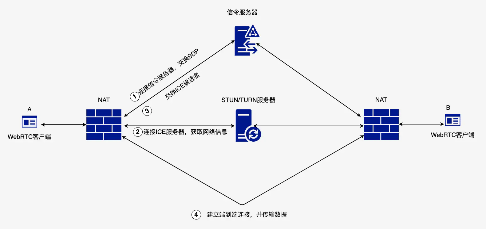 使用WebRTC进行实时通信的两端通常都位于防火墙或NAT之后的“内网”,只有很少部分主机能够拥有独立的公网IP而直接接入Internet。也就是说,尝试建立连接的双方由于位于NAT网络之中,不能直接使用内网IP地址建立网络连接。WebRTC于是使用“NAT穿透技术(俗称打洞)”来帮助两端建立连接。