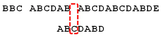 首先,字符串"BBC ABCDAB ABCDABCDABDE"的第一个字符与搜索词"ABCDABD"的第一个字符,进行比较。因为B与A不匹配,所以搜索词后移一位。